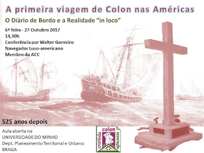 No próximo dia 27 o nosso Membro Walter Gameiro estará na Universidade do Minho para divulgar e debater as questões em torno da 1ª viagem de Colon às Américas, nomeadamente sobre quais as ilhas efectivamente alcançadas.